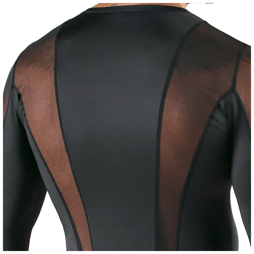 Schwarzes, figurbetontes Langarmshirt von Svenjoyment im stilvollen Zusammenspiel aus transparentem Mesh und blickdichtem Stretchmaterial. Der elastische Materialmix schmiegt sich weich an die Haut und ist sehr angenehm zu tragen.