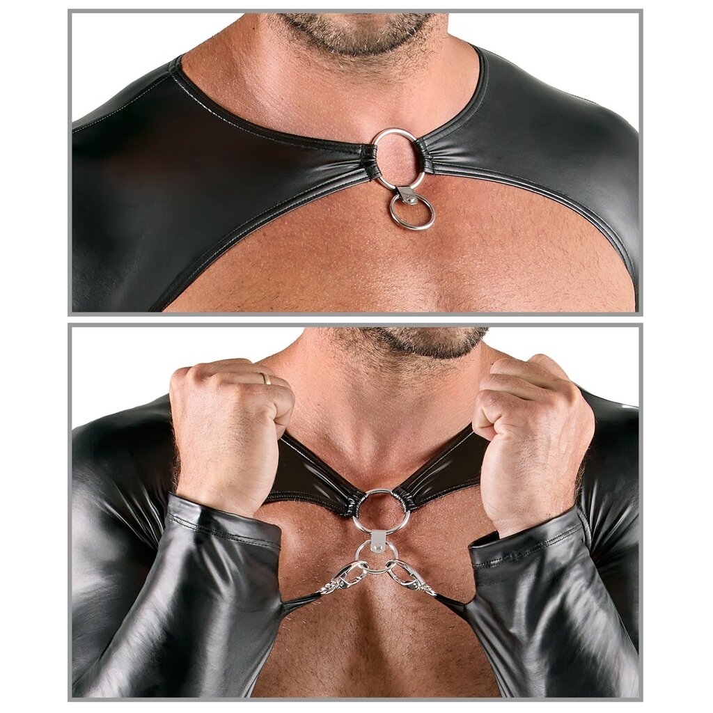 3-piece set from Svenjoyment Bondage with bolero, hip belt, and jock. Everything in a trendy matte black look – soft and elastic for maximum comfort. With many silver-colored rings and carabiners on the sleeves for versatile light bondage games.