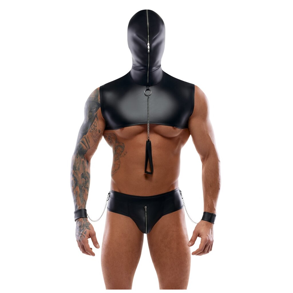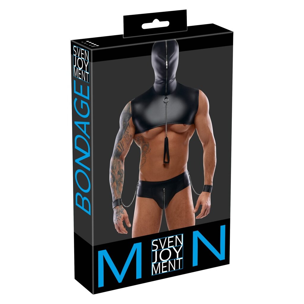 Short hooded top, riostring, leash and 2 handcuffs in a set by Svenjoyment BONDAGE. The noble black matt look nestles slightly elastic close to the skin. Belly and chestless top with sophisticated hood, which can be closed completely with the 2-way zip and encloses the head in an exciting way. Ring at the front of the neck to which the enclosed leash can be easily attached with its snap hook. Riostring at the front with zip underneath. At the waistband on each side a ring in which the two enclosed handcuffs can be hooked with their carabiner chains. The adjustable Velcro fasteners mean that the cuffs can be quickly put on for pleasurable fixations. Size S / Material composition: 90% polyester, 10% spandex