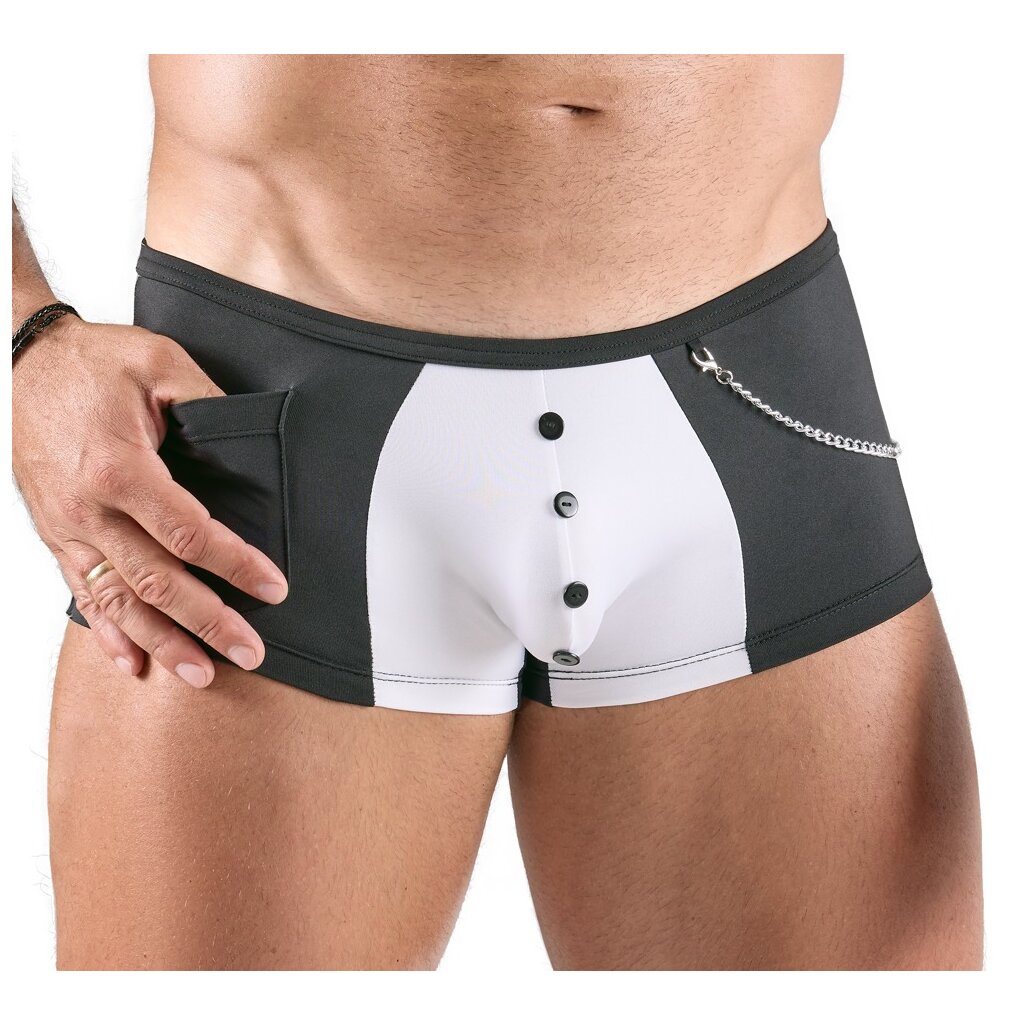 Pantalon moulant et seyant de Svenjoyment, style serveur noir et blanc, avec boutons décoratifs sur la poche. Élastiqué sur tout le pourtour, doux et souple pour un grand confort. Petite poche plaquée à l'avant. La chaîne mousqueton étroite de couleur argentée est amovible.