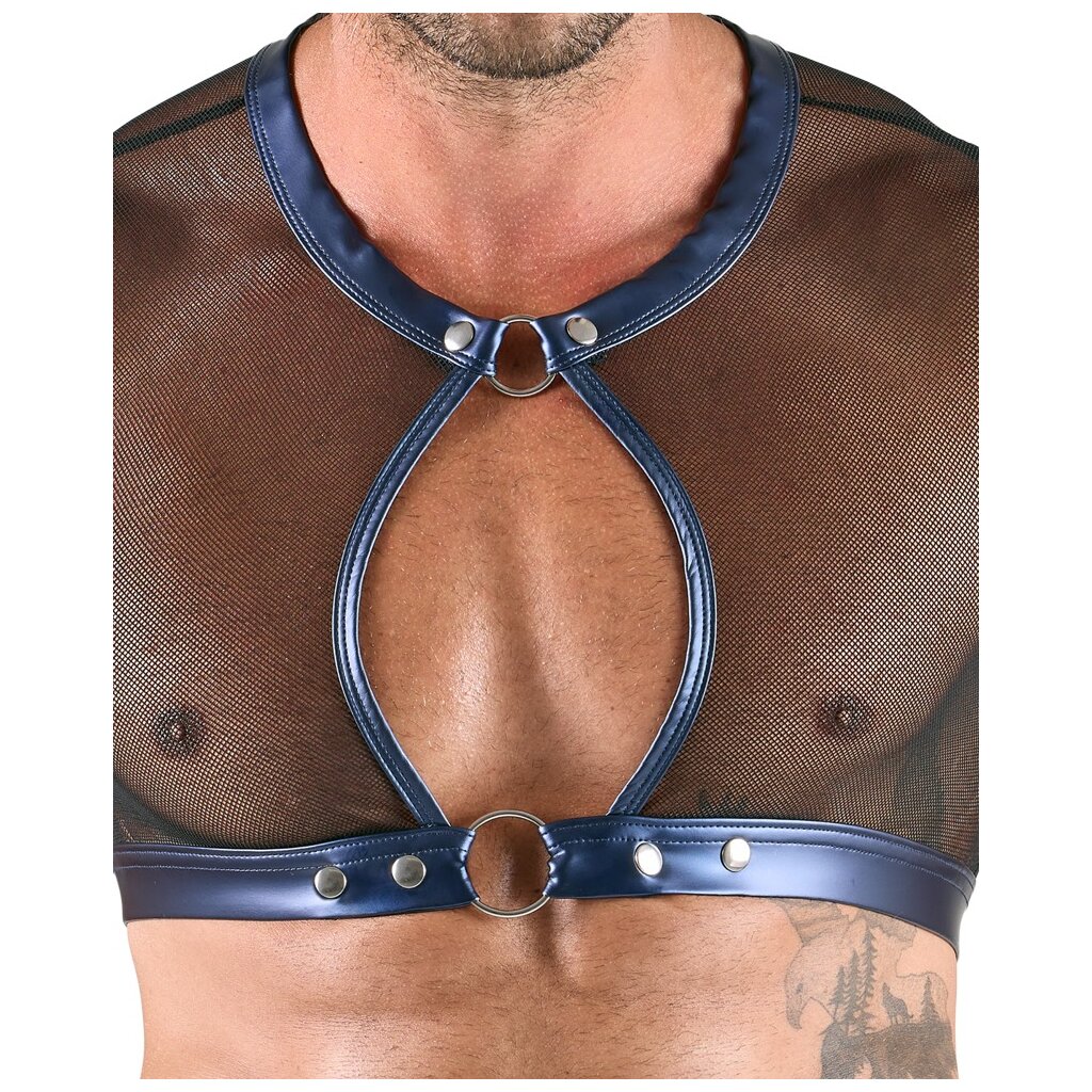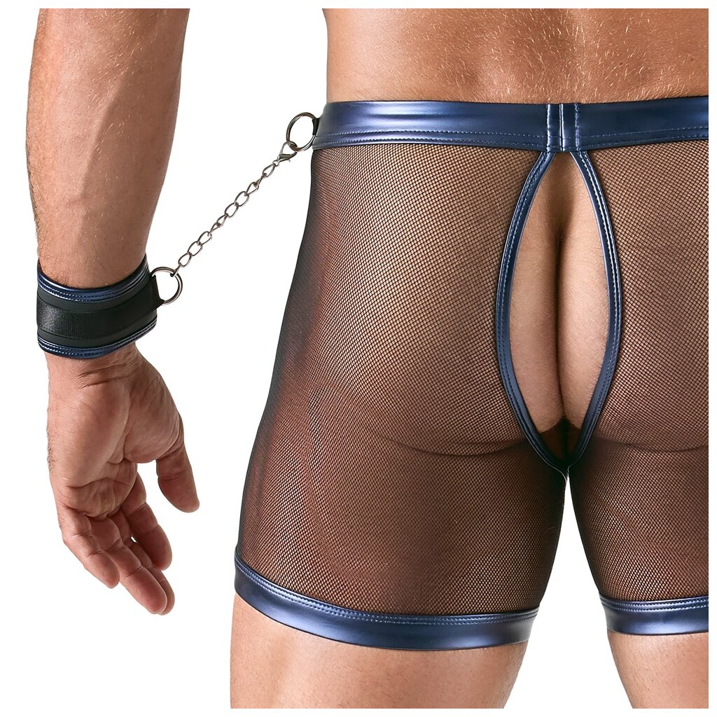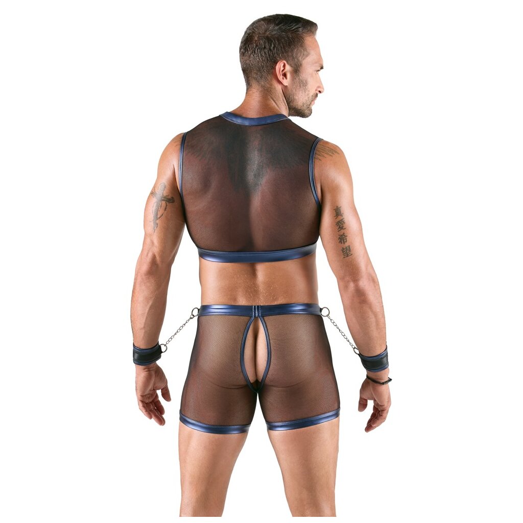 Tight-fitting short top, accentuating pants, and 2 handcuffs in a set from Svenjoyment Bondage. Black-transparent, elastic, soft mesh edged in an elegant blue metallic wet look. Striking accents of silver-colored studs and rings. Top and pants with revealing cutouts at the front. The pants are also open at the back. The two included handcuffs can be quickly attached to the top and pants with their carabiner chains. The soft cuffs in blue metallic wet look are easy to put on and adjust for sensual restraint thanks to Velcro fasteners.