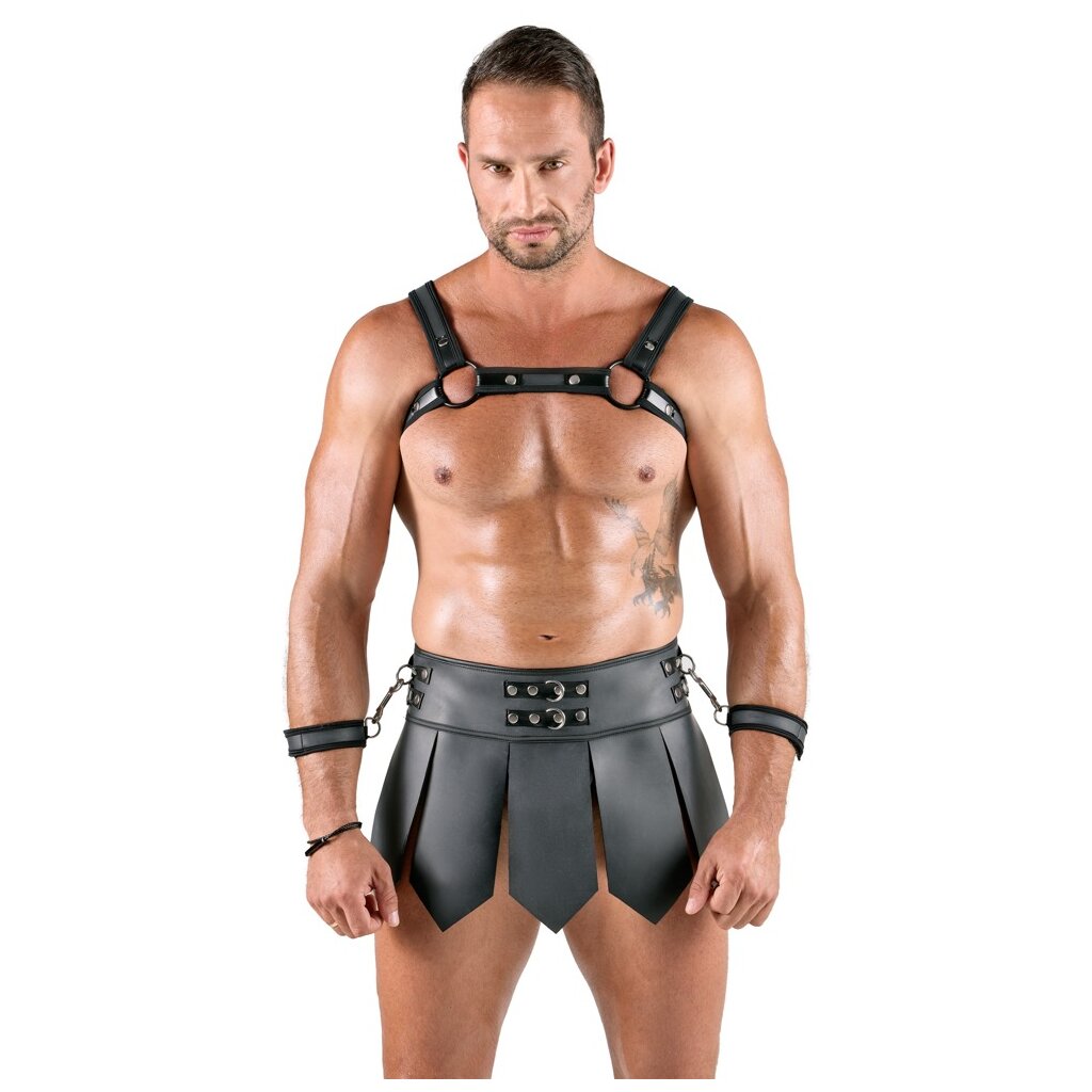 Chest harness, gladiator skirt, and 2 handcuffs in a set from Svenjoyment Bondage. Matte black, eye-catching material – slightly elastic for high wearing comfort. Harness with practical snap fasteners for quick donning and doffing. Short skirt with stylish lacing at the back. Straps with studs and rings at the front and sides of the waistband. The two handcuffs included can be quickly attached with their double carabiners. The soft restraints can be quickly put on thanks to Velcro fasteners and adjusted for pleasurable bondage games.