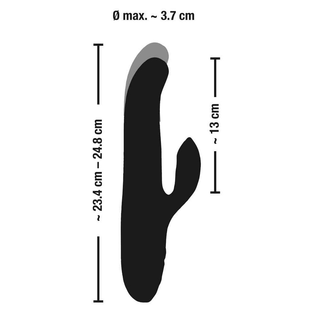 Longueur totale 23,4 cm à 24,8 cm, longueur d'insertion 13 cm, Ø 2,8 à 3,7 cm. Poids 306 g. Silicone, PU, ABS.