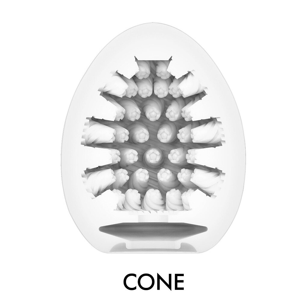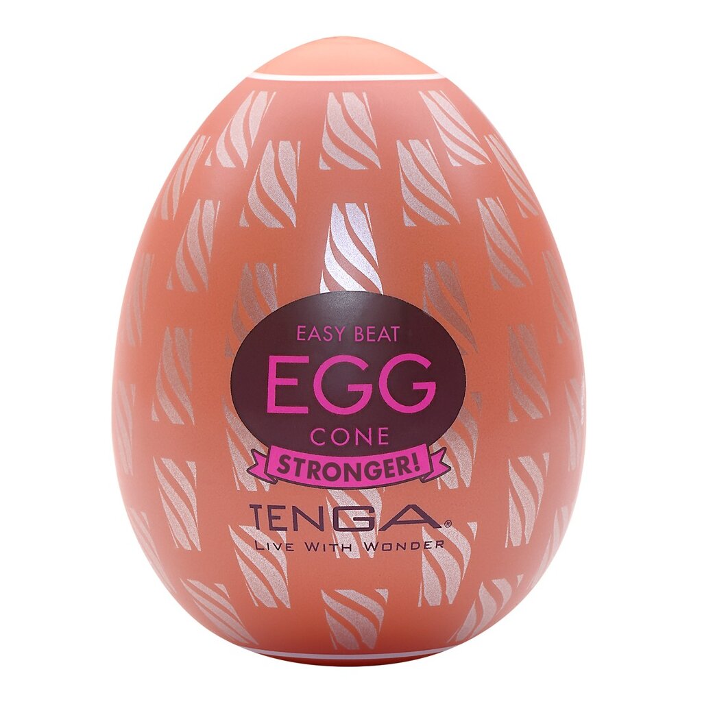 Disposable masturbator Egg Cone Stronger from Tenga with a new and intense cone stimulation texture inside for particularly strong sensations. The ultra-flexible masturbator sleeve is located in the discreet egg-shaped case and is used together with the included lubricant during a handjob.