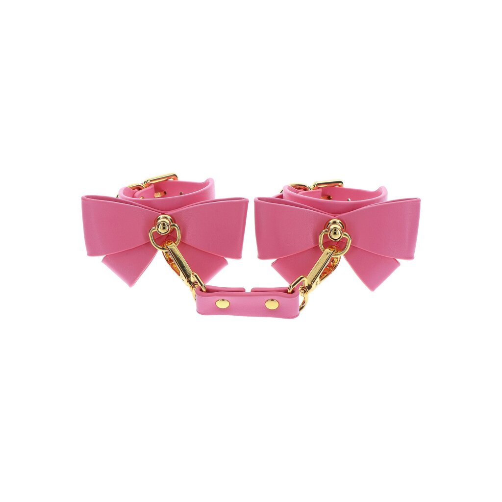 Add a touch of cuteness and sexiness to your bondage collection with these Taboom Malibu wrist cuffs. Show off your playful side with these pink cuffs made from vegan polyurethane leather, adorned with a charming bow and alluring gold-plated metal details. Combine style and pleasure, explore the world of bondage games or wear them as a fashion statement. The adjustable fit ensures comfort and security during intimate moments. The solid clips and rings allow for different games and offer endless possibilities for bondage and pleasure. Indulge in passionate adventures and express your unique style with these exquisite wrist restraints.
