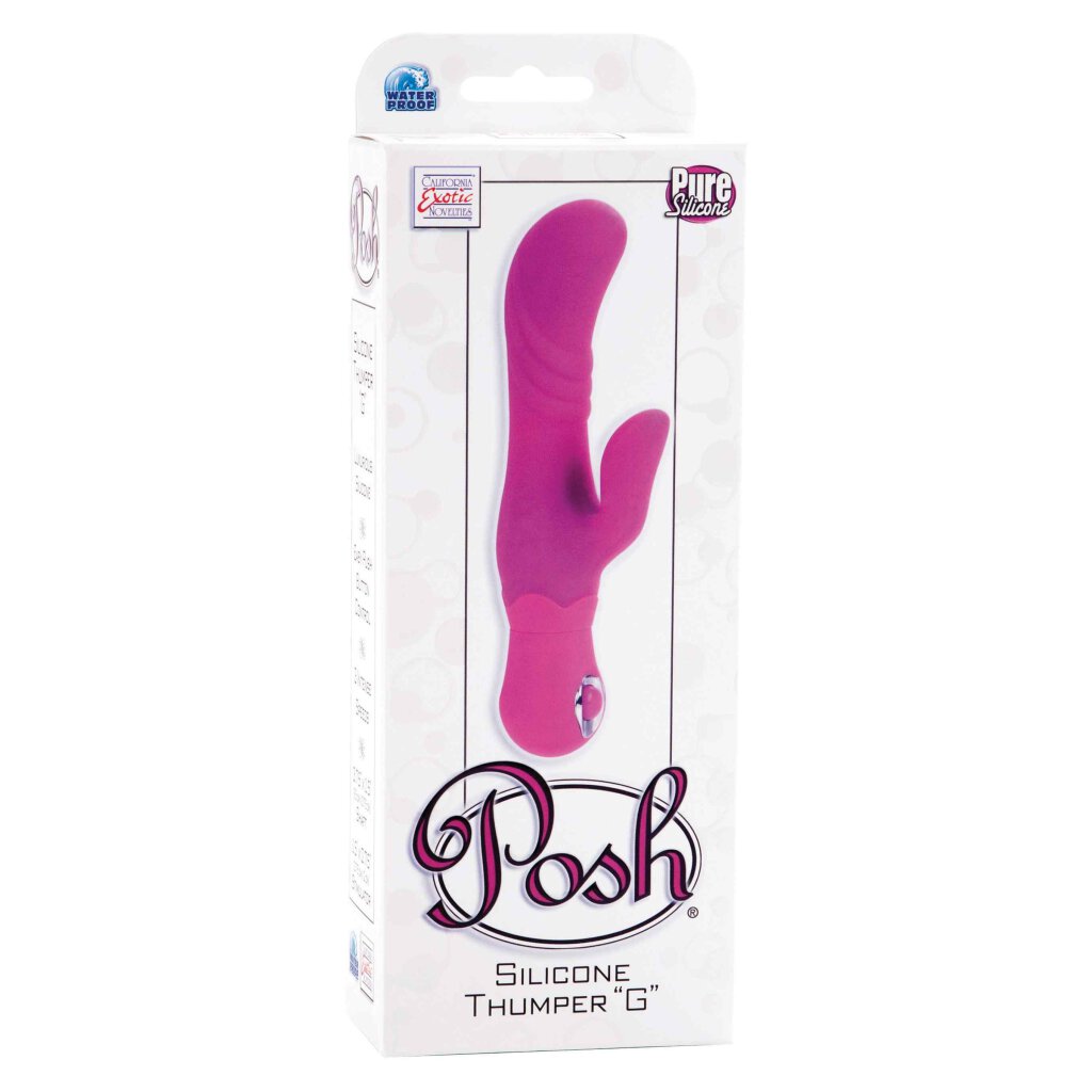 The Posh Silicone Thumper 'G' delivers powerful pleasure to all your most sensitive spots. Its uniquely curved tip and lustfully ribbed shaft are perfect for wonderfully textured G-spot stimulation. When you're ready to lose yourself completely in the waves of pleasure, press the petite clitoral stimulator against your clitoris for simultaneous stimulation that will have you squirming and moaning in pleasure.The dual teaser is made from silky soft, luxurious and body-safe silicone that will pamper you with its gentle caress. You'll love the flowing curves and feminine accents of this compact G-spot stimulator. The dual massager features an elegant silver ring that highlights all the functions of the small button inside: Simply insert 1 AA battery and press the small button to explore the massager's 3 powerful vibration speeds. It's waterproof for sexy play in and out of the water. And at 9.5 cm long and 3.75 cm wide, it's the perfect size to fit in your handbag and satisfy your desires anytime, anywhere. The double massager is perfectly shaped to tease, tickle and pave the way to amazing orgasms. Total length: 9.5 cm / Diameter: 3.75 cm / Insertable length: 9.5 cm / Vibration modes: 3 / Waterproof / 1 AA battery required / Material: Silicone