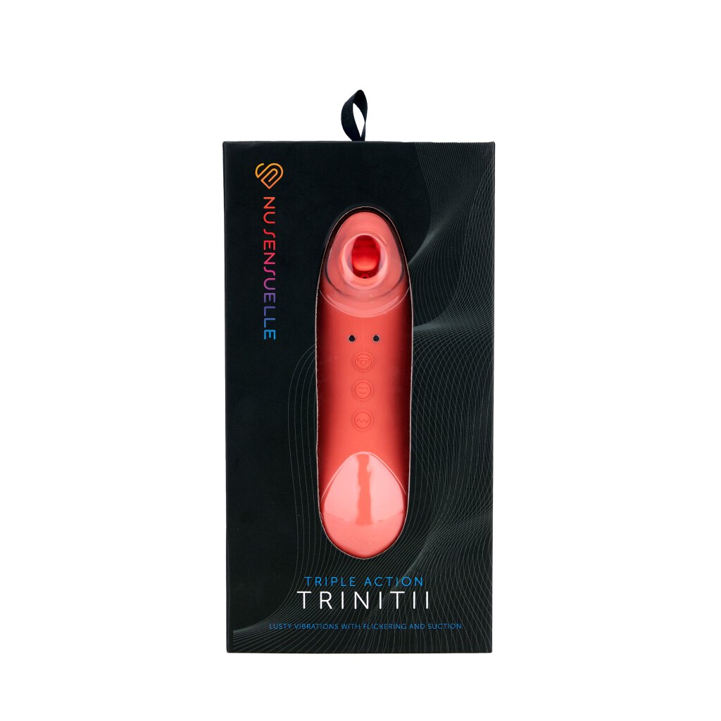 Trinitii lives up to its name, combining three different sensations to provide incredibly unique and powerful clitoral stimulation. One look at Trinitii is enough to know that it's not your typical toy. Start by placing the soft, open tip of Trinitii over the clitoris to experience a gentle suction. This indirect stimulation is perfect for those who don't always want direct contact. Next comes Trinitii's flickering tongue, which mimics the sensation of oral sex. And last but not least, Trinittii's vibrations provide a final thrill that you'll feel wherever it touches your skin. The result is multi-layered stimulation like you've never experienced before. And of course, you can control all three forms of stimulation independently. Trinittii offers 15 vibration patterns, 7 suction intensities and 4 speeds of flickering tongue movement, so you can customise your pleasure every time. Total length: 16 cm / Diameter: 2.5 cm / 4 vibration modes / 15 speed modes / 7 suction intensities / Splash-proof / Material: silicone / Rechargeable