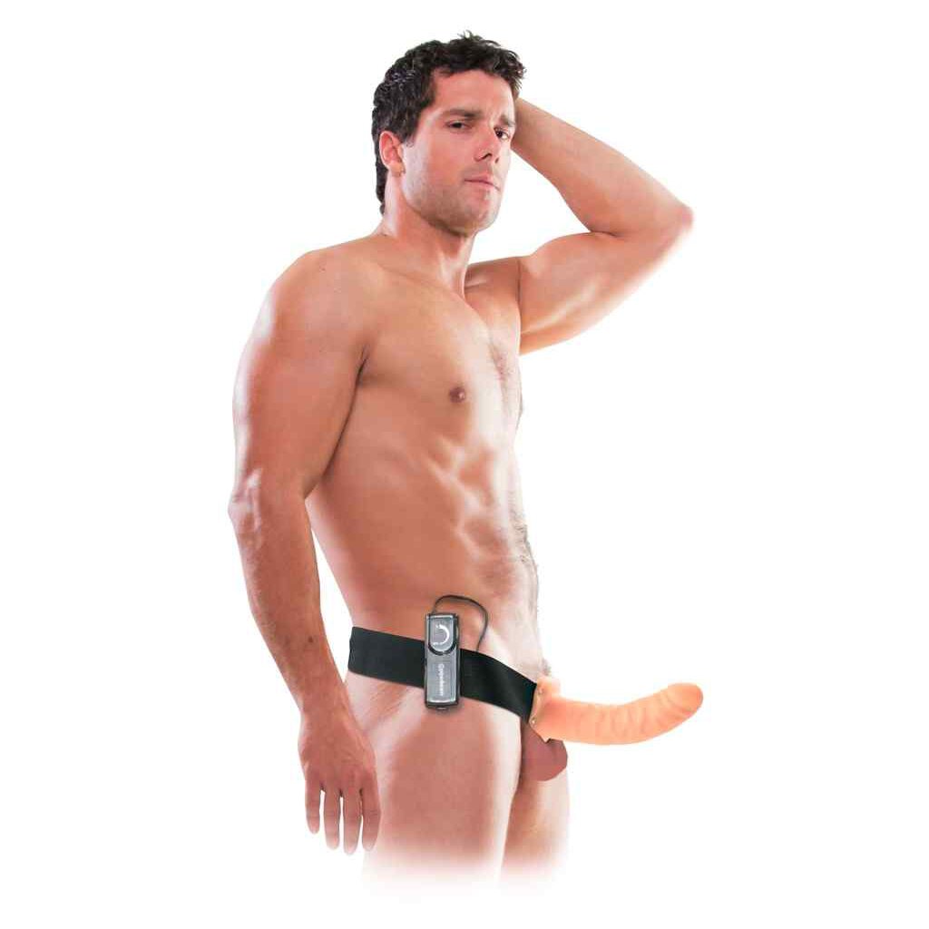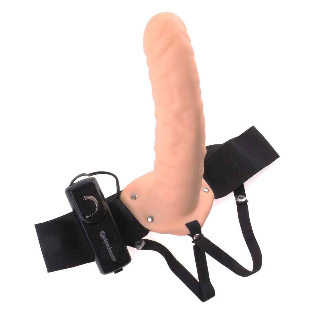 Hollow realistic dildo with an elastic, adjustable harness and multi-speed vibration that can be adjusted with the remote control on a wire. HE wears it for more length and girth. SHE wears it to pleasure her/him. Please order batteries separately: 2 x AA.