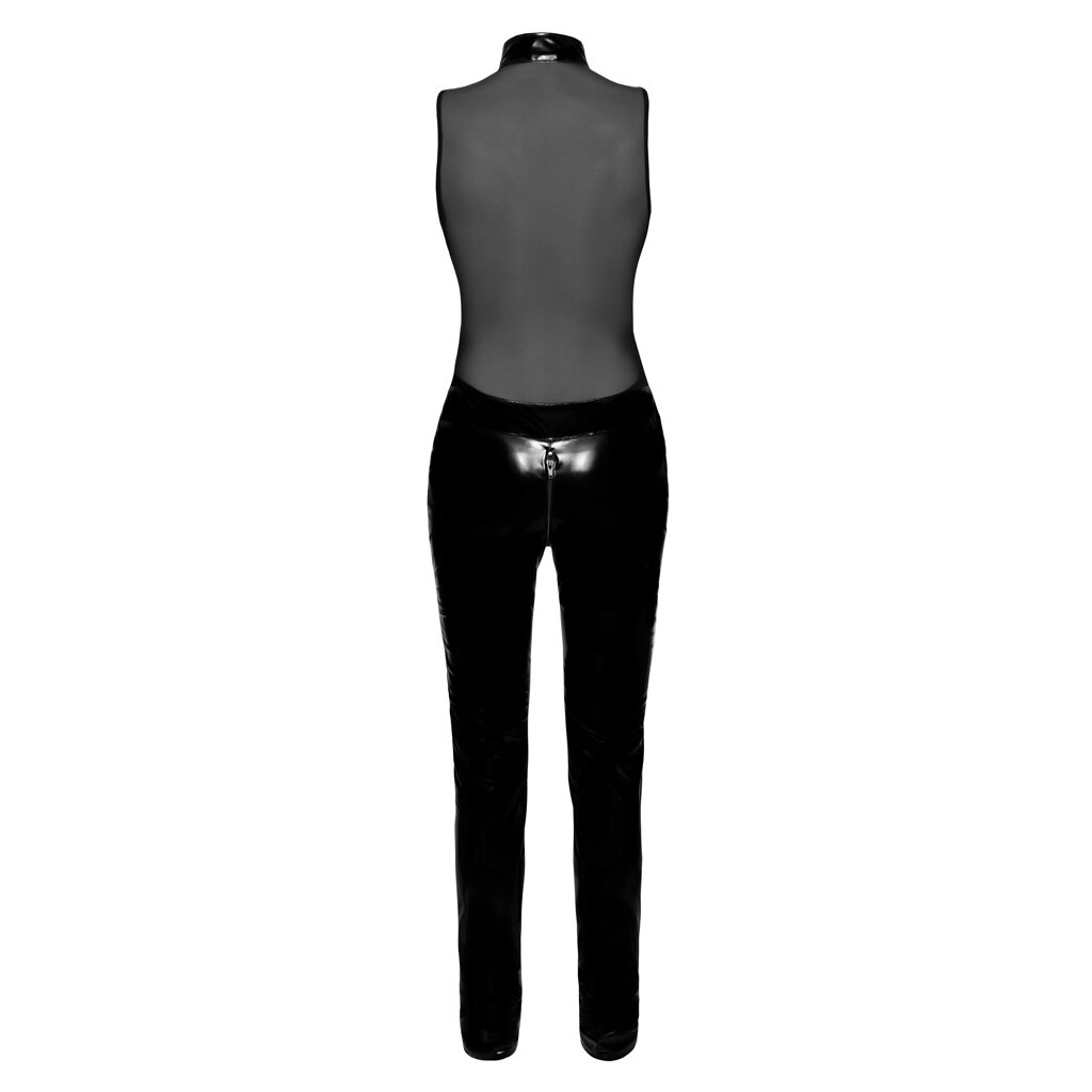 Combinaison sans manches de Black Level en vinyle noir brillant avec dos transparent en powernet. Coupe moulante avec une longue jambe étroite et une ceinture décorative devant avec une boucle accrocheuse. La fermeture à glissière à double sens pratique et érotique, qui part du décolleté profond, passe par l'entrejambe et passe au-dessus des fesses, est raffinée et peut être ouverte rapidement des deux côtés.