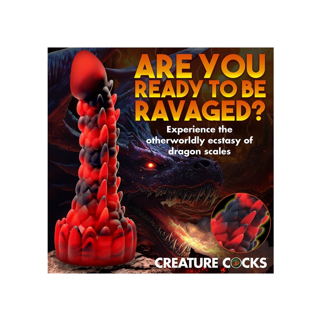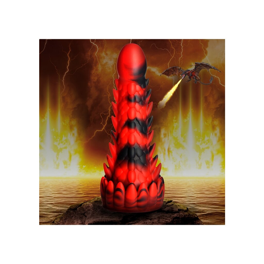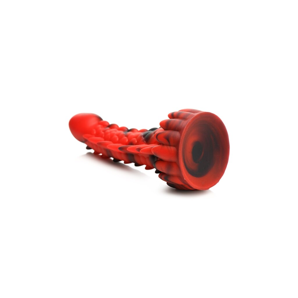 This scaly, dragon-inspired dildo impresses with its red and black design.