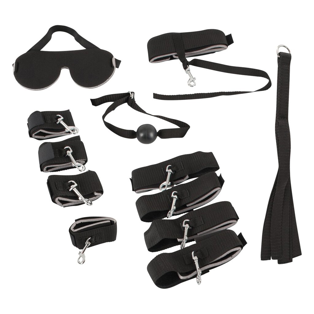 Transportabler und dick gepolsterter (ca. 5 cm) Lounger (zusammengeklappt ca. 60 x 60 cm und ausgeklappt ca. 120 cm x 60 cm) mit angebrachten D-Ringen (10 St), die für die diversen Fesseln mit Karabinern dienen (Gesamtgewicht ca. 7 kg). Zusammegeklappt kann der Lounger mittels Tragegriffen bequem transportiert werden (Inkl. Bondage-Zubehör). 2 Paar Oberschenkel-Fessel (Länge ca. 56 cm / Breite ca. 6 cm) verstellbar mit Karabiner. 2 Paar Hand-Fessel (Länge ca. 39 cm / Breite ca. 6 cm) verstellbar mit Karabiner 1 Halsband (Länge ca. 58 cm / Breite ca. 6 cm) verstellbar mit Karabiner und Verbindungsband (ca. 55 cm lang) 1 Peitsche (ca. 38 cm), 1 Mundknebel (Ball ca. Ø 40 mm), 1 Augenmaske ca. 19 cm breit Achtung: Benutzung auf eigene Gefahr!