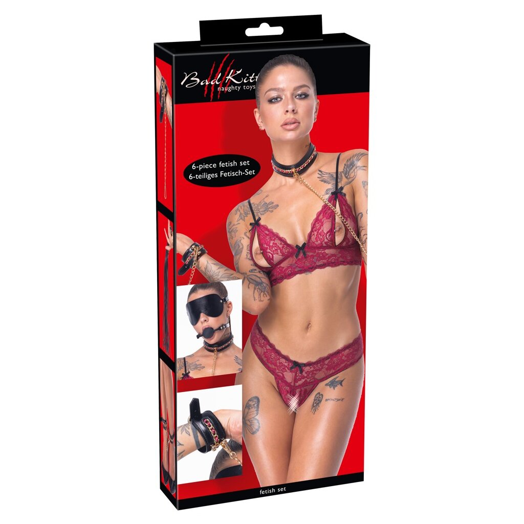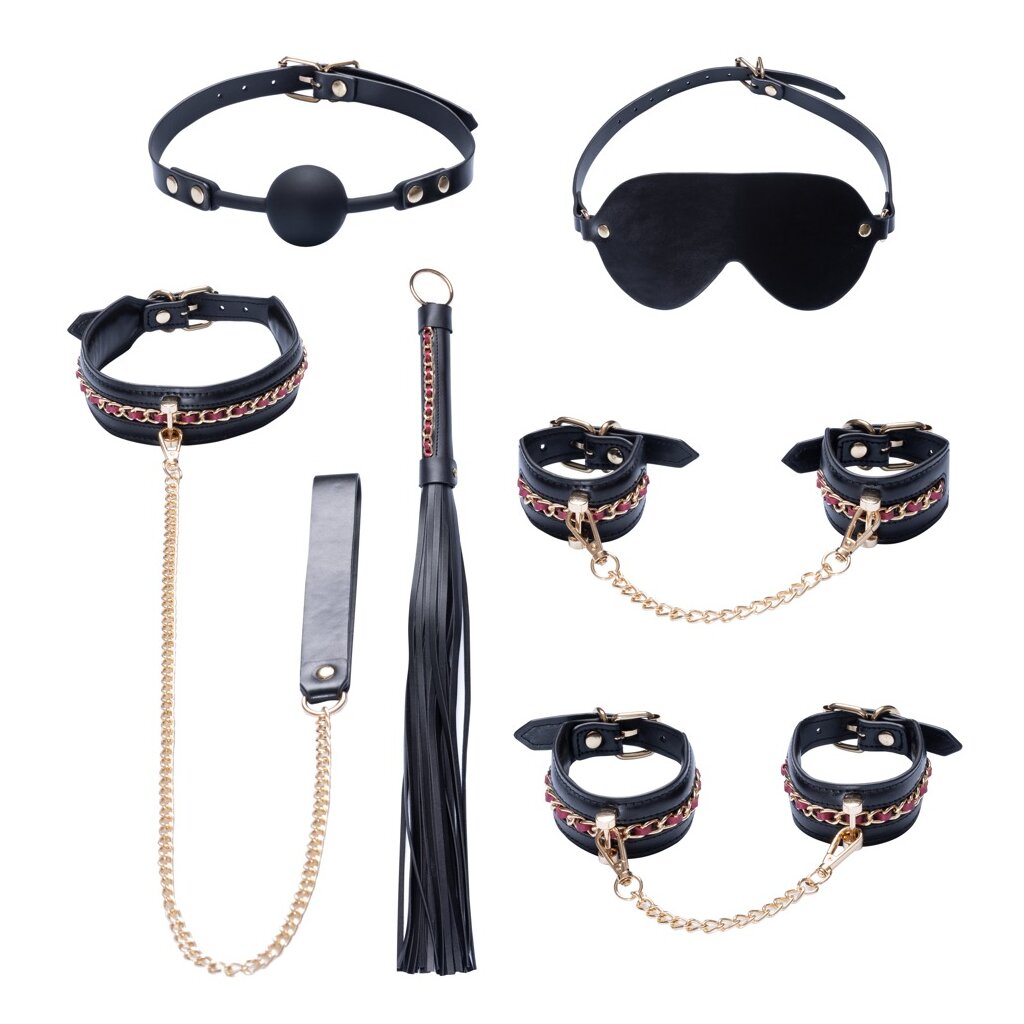 Dieses exklusive 6-teilige Bondage-Set von Bad Kitty kombiniert Eleganz, Funktion und prickelnde Sinnlichkeit. Hergestellt aus stilvollem schwarzem Lederimitat mit roten Akzenten und edlen goldfarbenen Accessoires, zieht es die Blicke auf sich und lädt zu intensiven Rollenspielen ein. Das luxuriöse Set enthält alles, was du für fantasievolle Fesselabenteuer brauchst – von klassischen Hand- und Fußfesseln über eine Halsfessel mit abnehmbarer Kettenleine bis hin zu einem Silikonknebel, einer Augenmaske und einer 52 cm langen Minipeitsche.