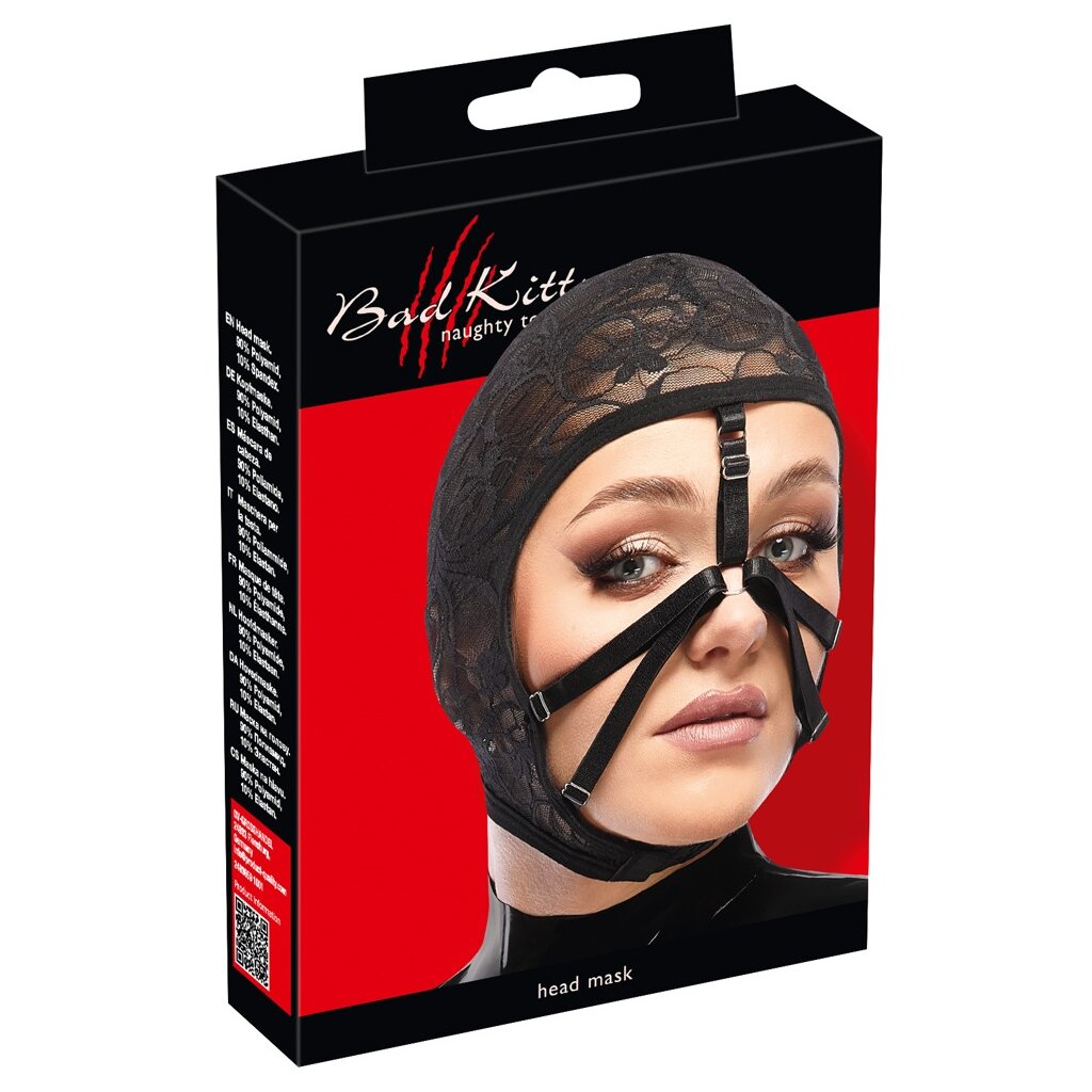Schwarze Kopfmaske von Bad Kitty aus feiner elastischer Spitze. Schmiegt sich sanft um den Kopf und passt sich perfekt an für hohen Tragekomfort. Offenes Sichtfeld mit schmalen, verstellbaren Bändern für einen ausgefallenen Look.