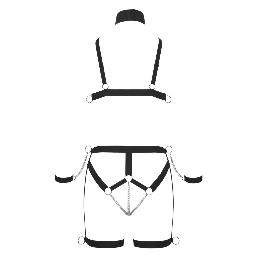 The set also includes a matching collar with a ring and hook closure, as well as adjustable wrist cuffs with velcro fastenings. Thanks to the detachable chains with carabiners, you can customize your restraint play as you like or remove them completely.