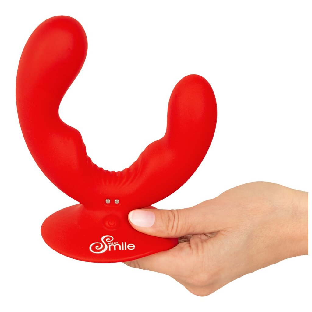 Der Dual Vibrator von Sweet Smile verwöhnt Dich mit gleich zwei geschwungenen Lustarmen, die sich Deinem Körper sanft und flexibel anpassen. Der größere Vibrator gleitet mit seiner 13,5 cm einführbaren Länge voll, präsent und kraftvoll in Dich hinein, während der kleinere mit seinen 9 cm zusätzliche Reize schenkt – vaginal und anal zugleich oder in jeder Kombination, die Deine Fantasie hergibt. Die seidig-softe Oberfläche und die ausgeprägten Stimulationsrillen massieren zusätzlich den sensiblen Damm und verstärken jede Welle der Erregung.