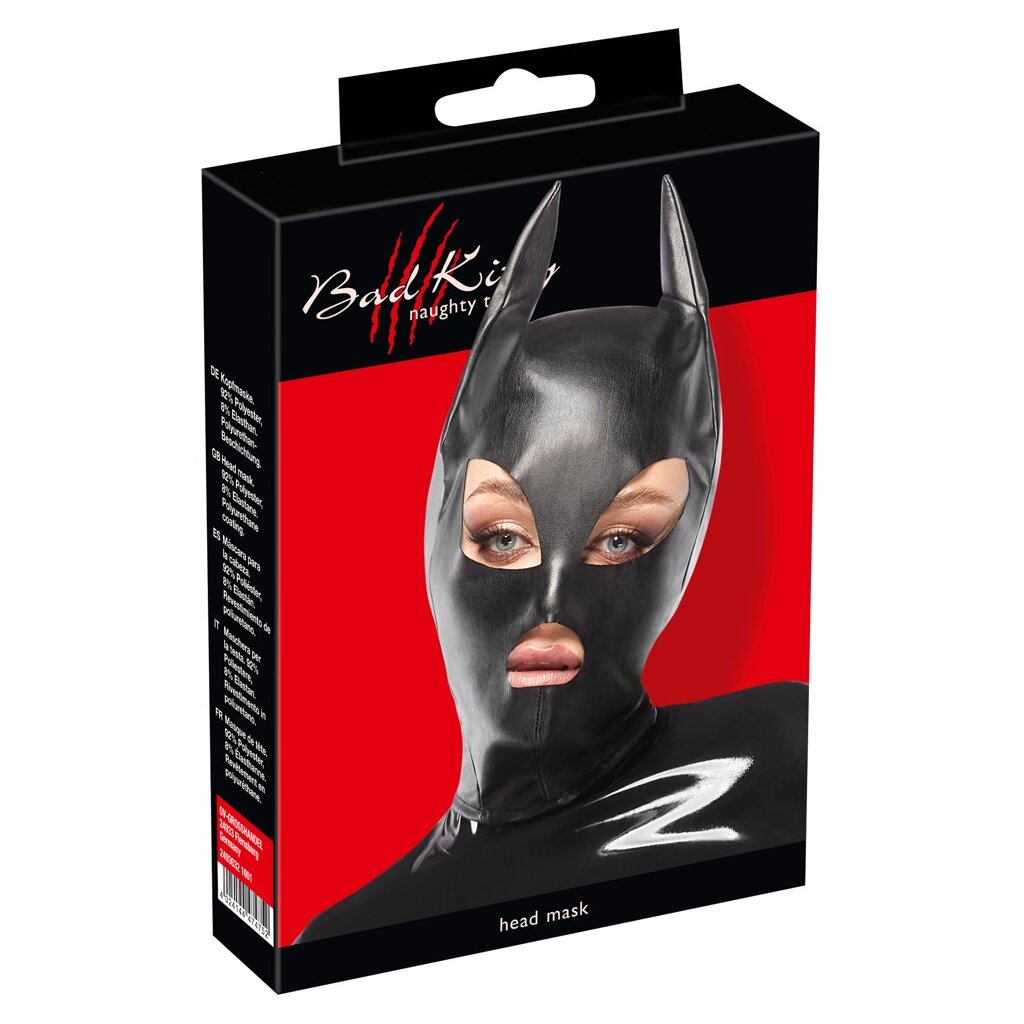 Black, tight-fitting head mask from Bad Kitty made of stylish faux leather. With pointed ears, mouth and eye openings. Soft, elastic and supple.