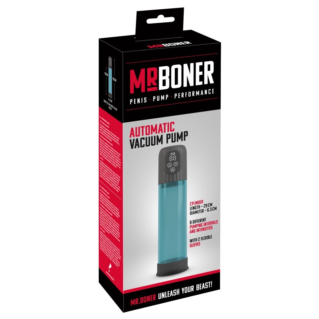 Pompe à vide automatique de Mr. Boner pour un entraînement efficace et amusant du pénis et de la puissance. Entièrement automatique et pratique, il suffit d'appuyer sur un bouton ! Un moteur puissant fournit l'énorme puissance d'aspiration en 8 modes avec différents intervalles et intensités. Un bouton de déverrouillage assure une manipulation sûre et une égalisation rapide de la pression.