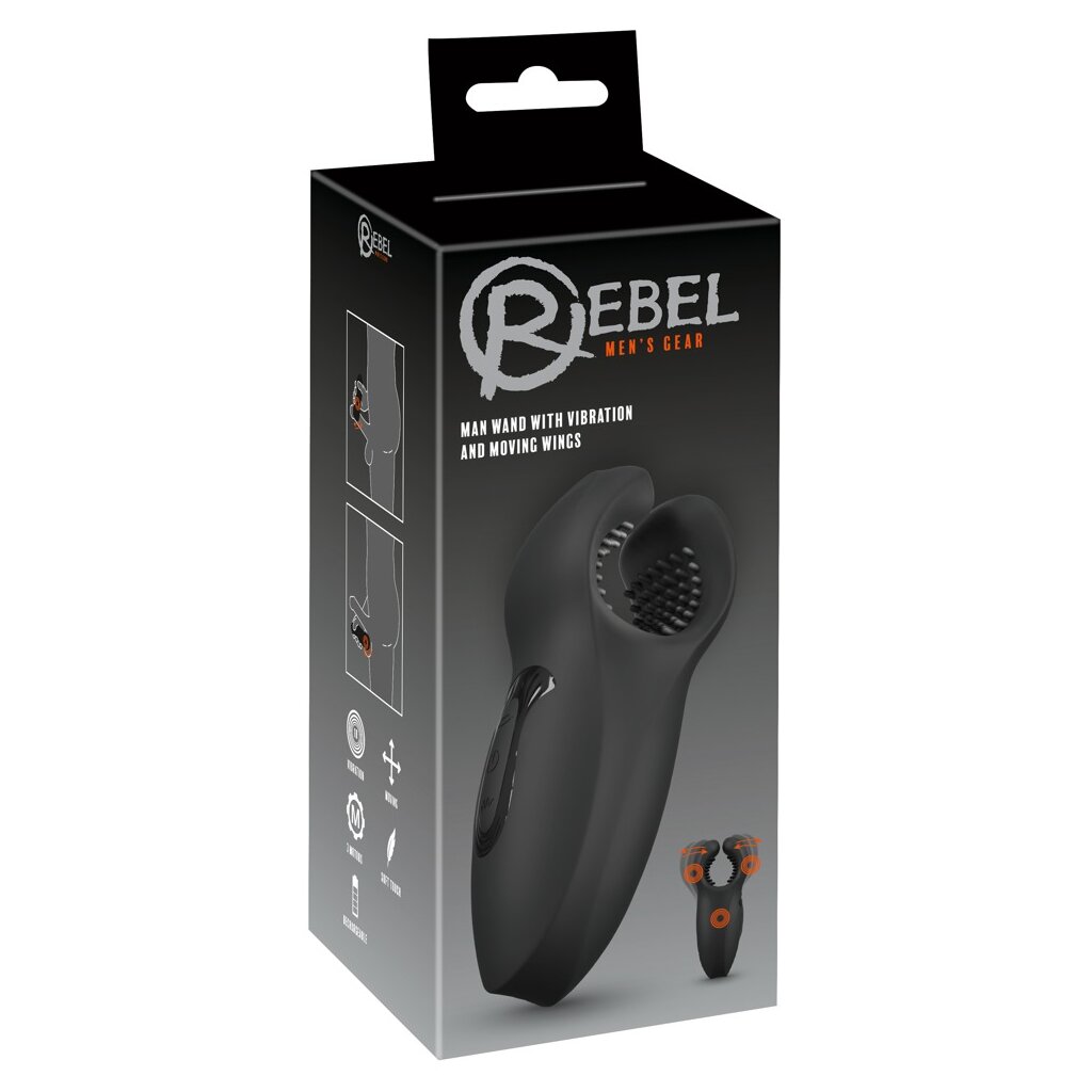 Der Man Wand mit Vibration und beweglichen Flügeln von Rebel umschließt den Penis oder die Hoden fest mit seinen beweglichen Vibro-Flügeln. Er stimuliert auch mit weichen Noppen und intensiven Vibrationen. Ein perfekter Handjob auf Knopfdruck!