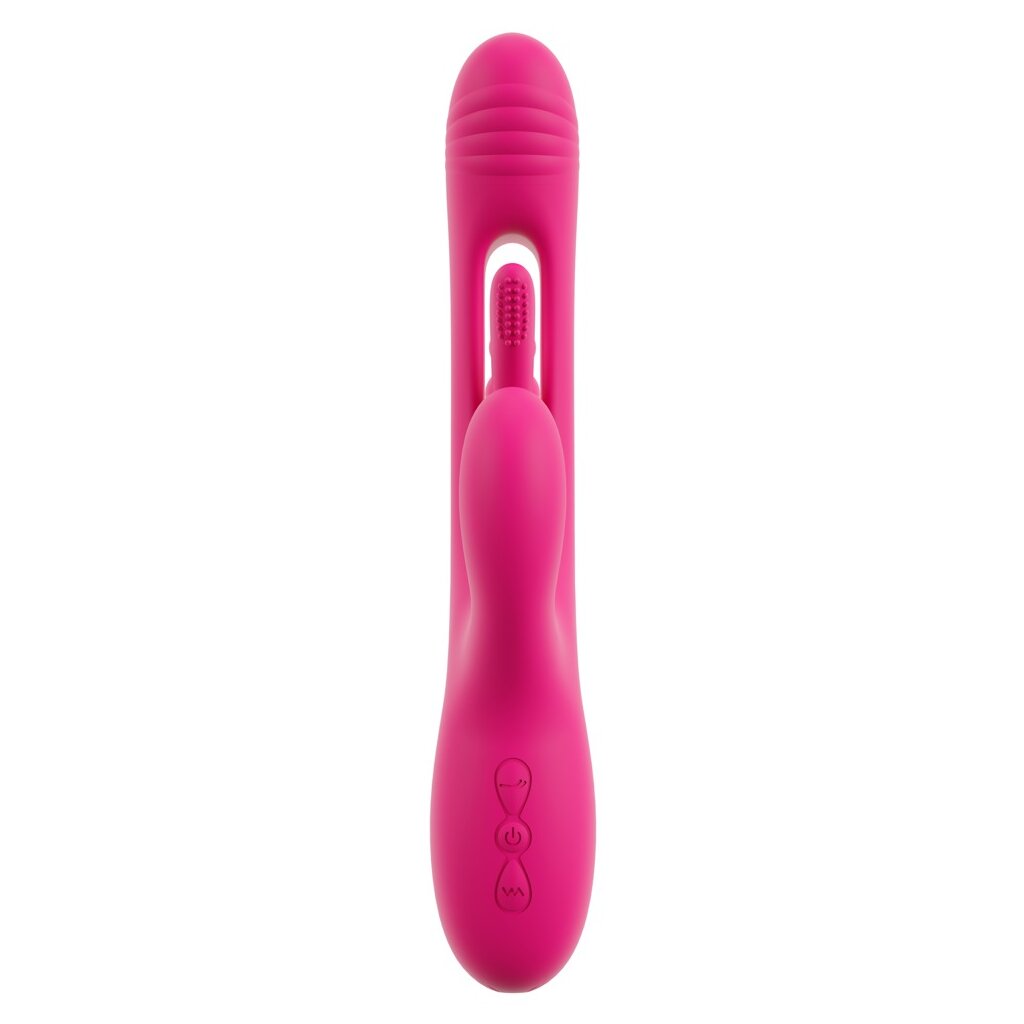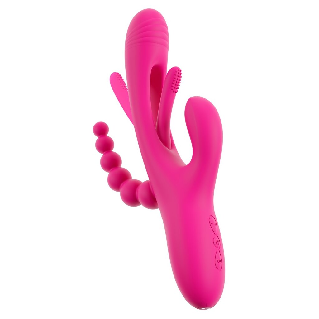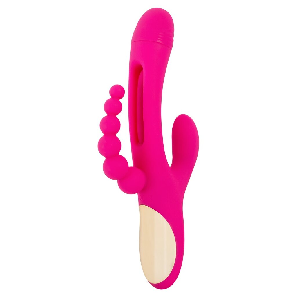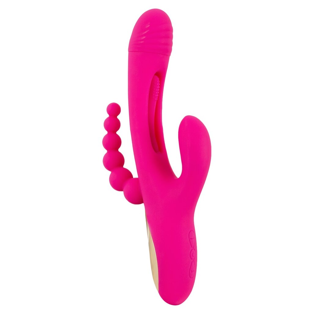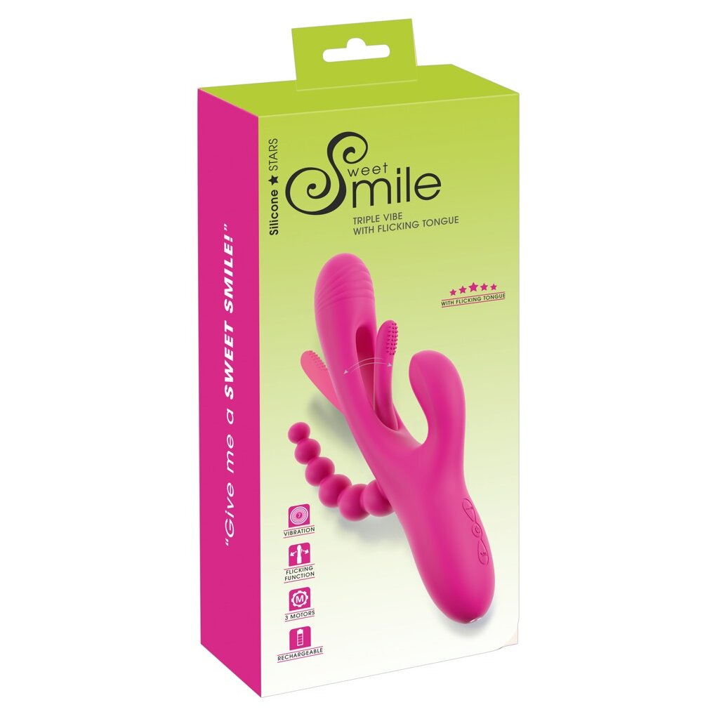 Starker Triple Vibe With Flicking Tongue von Sweet Smile für dreifache Action: Vagina, Klitoris und die Analregion werden zugleich verwöhnt! Für klopfende Impulse in der Vagina sorgt die hin und her schwingende softe Noppen-Zunge, die sich im Schaft verbirgt (Flicking Tongue). Dazu bieten die Vibrationen im Kopf und den beiden Stimulatoren zusätzliche intensive Stimulationen. Ist der 3-armige Vibrator komplett eingeführt, verwöhnt er sogar freihändig – einfach zurücklehnen und genießen!
