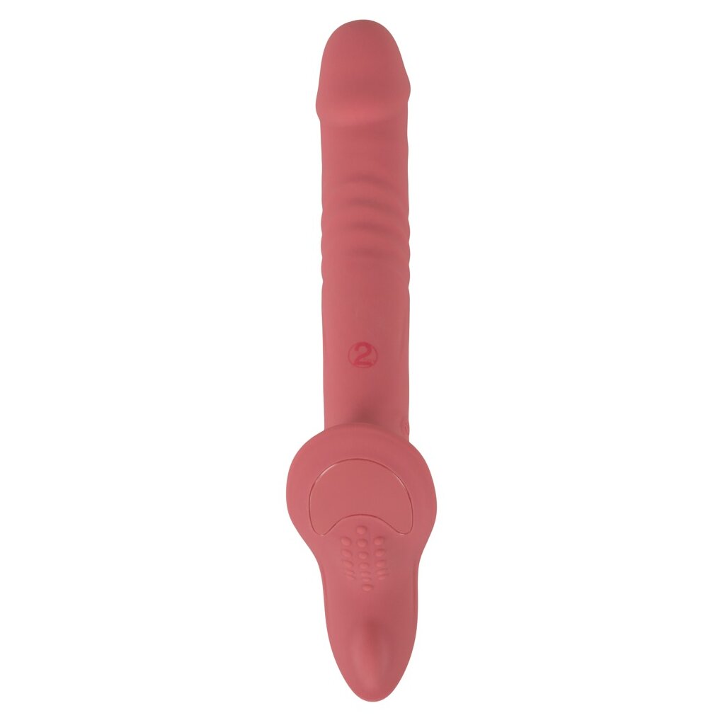Er verfügt auch über eine automatische Stoßfunktion, die das Strap-on-Vergnügen kraftvoll und tief unterstützt. Der aktive Teil genießt die anatomisch perfekte Form des Strap-On, der gegen Vulva und Klitoris vibriert. Der passive Teil genießt den Vibratorschaft mit seiner strukturierten Eichel und den stimulierenden Rillen, der immer wieder stößt. 7 Vibrationsmodi und 3 Stoßintensitäten können direkt am Toy oder - noch bequemer - separat mit der Fernbedienung (Reichweite 8 m) gesteuert werden. Der Schockvibrator lässt sich ganz einfach aus dem Strap-on-Tanga herausnehmen.