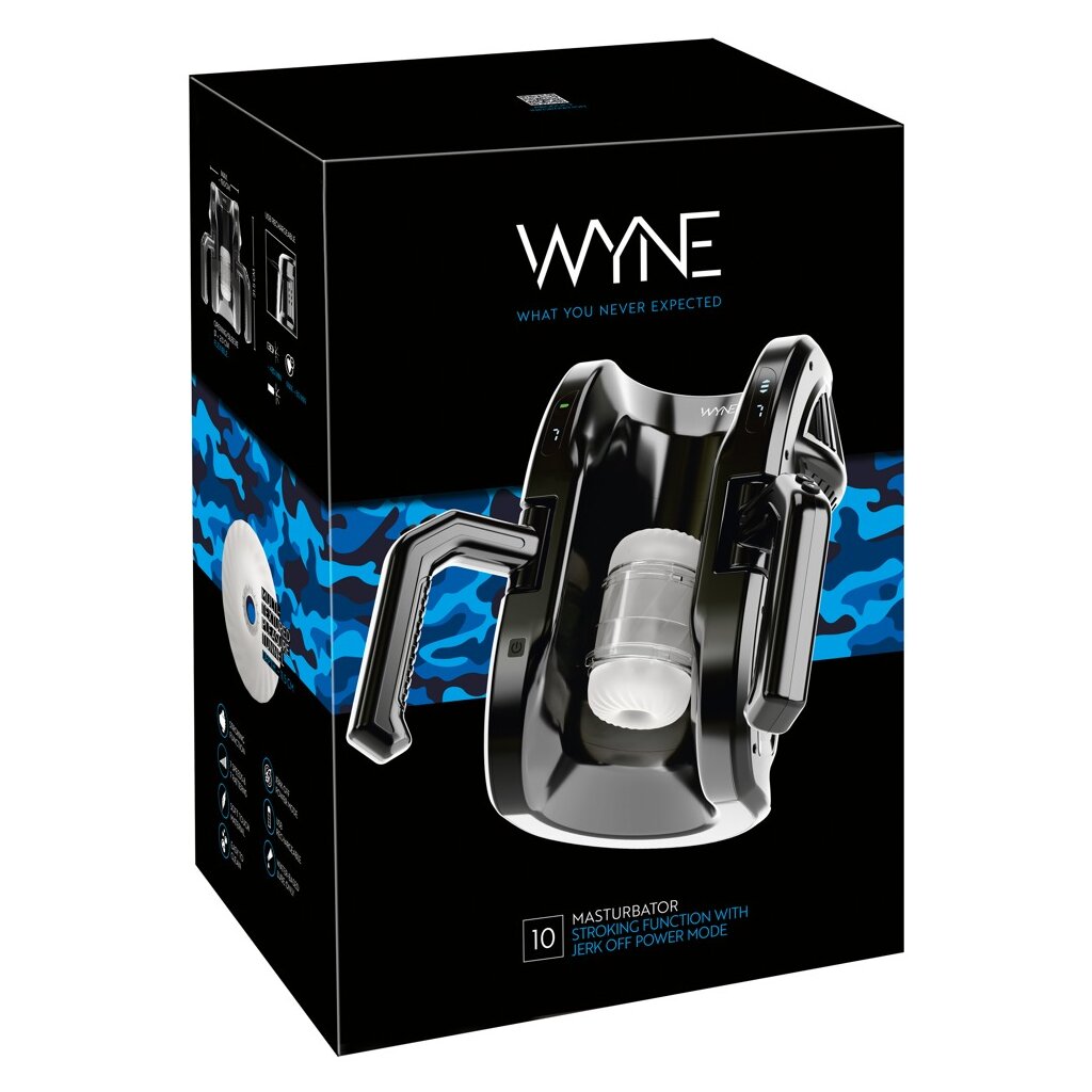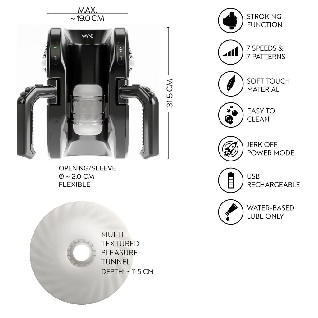 Masturbateur puissant 10 de WYNE, qui masse et dorlote intensément le pénis dans le manchon de masturbation de haut en bas, sur toute la longueur jusqu'à 28 cm. Les poignées pratiques sur les côtés offrent un confort maximal et une manipulation très facile. Une masturbation confortable entièrement automatique sans fatigue des mains !
