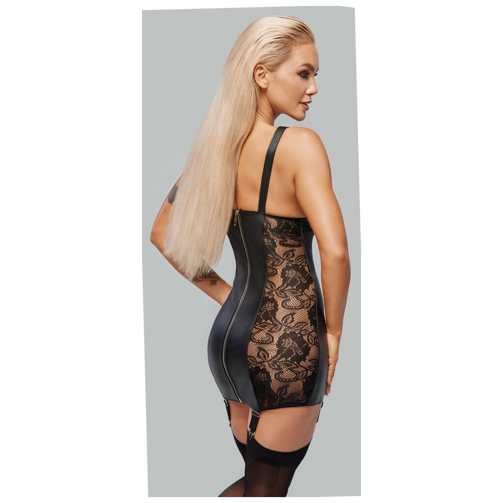Slim, short, strapless garter dress from ZADO made of soft lamb leather with silver-colored metal details. The exposed breasts are excitingly framed by leather straps. Spectacular back view with two wide elastic lace inserts and a continuous zipper in the middle. The straps are adjustable with buckle closures. The 4 adjustable garter holders can be removed from the mini dress.