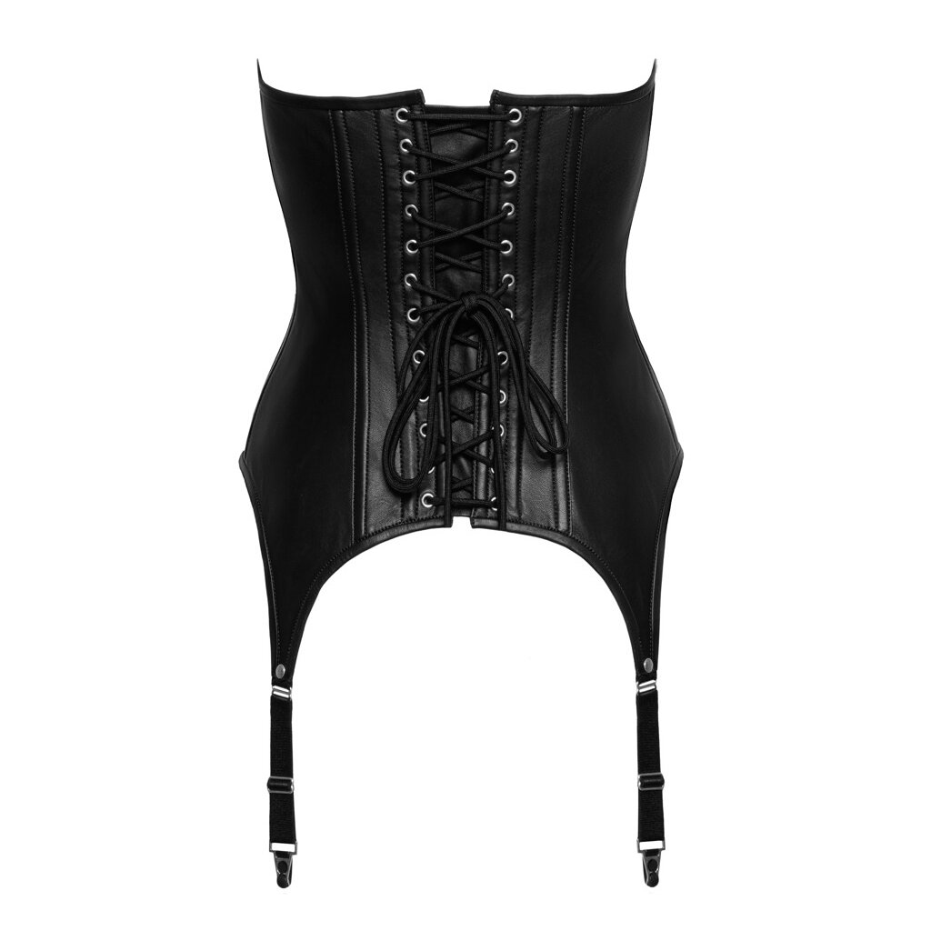 Corsage porte-jarretelles sans bretelles et non doublé de ZADO, fabriqué en cuir d'agneau souple avec des détails en métal de couleur argentée. Des bandes de modelage flexibles intégrées et un laçage variable doublé à l'arrière pour une silhouette magnifiquement ajustée. Fermeture éclair sur toute la longueur à l'avant pour un habillage et un déshabillage faciles. Les bretelles porte-jarretelles sont réglables.