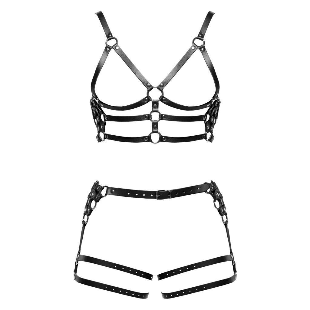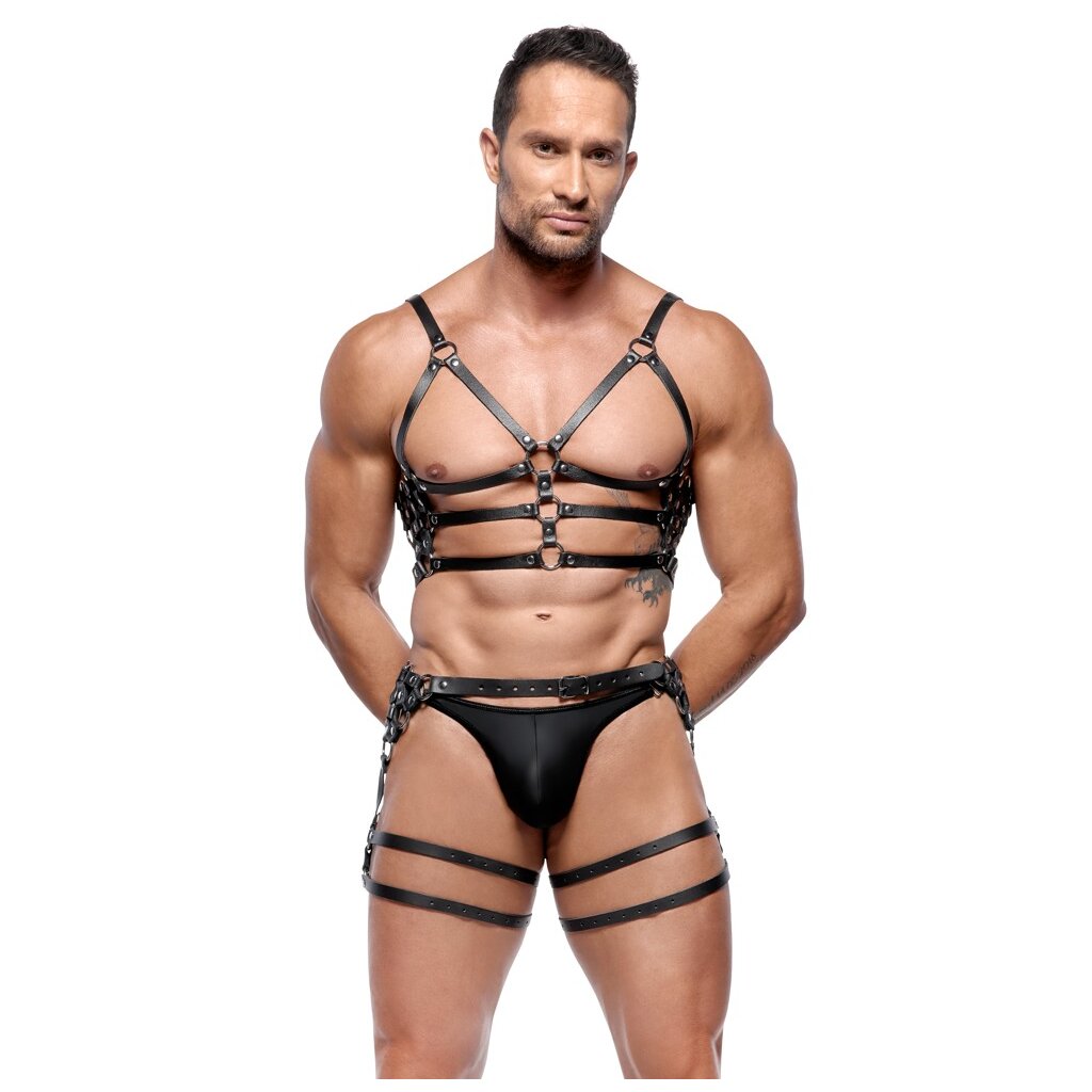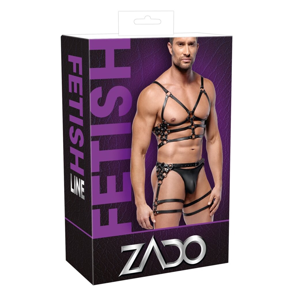Harnais robuste de ZADO en cuir noir avec détails métalliques argentés. Il se compose d'une ceinture thoracique et d'une ceinture de hanches, ainsi que de sangles de cuisses solidement fixées. Les deux parties sont réglables à l'aide de boucles pour un ajustement parfait et confortable.