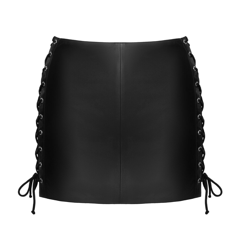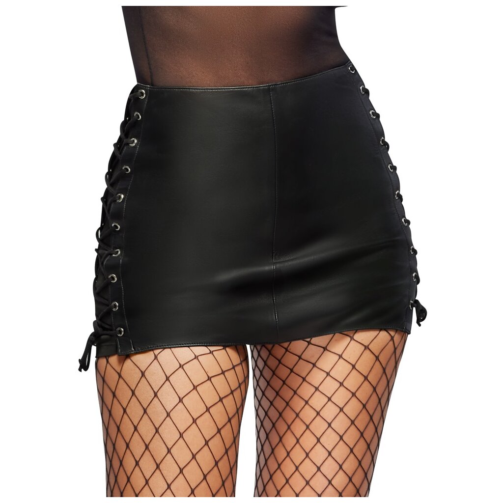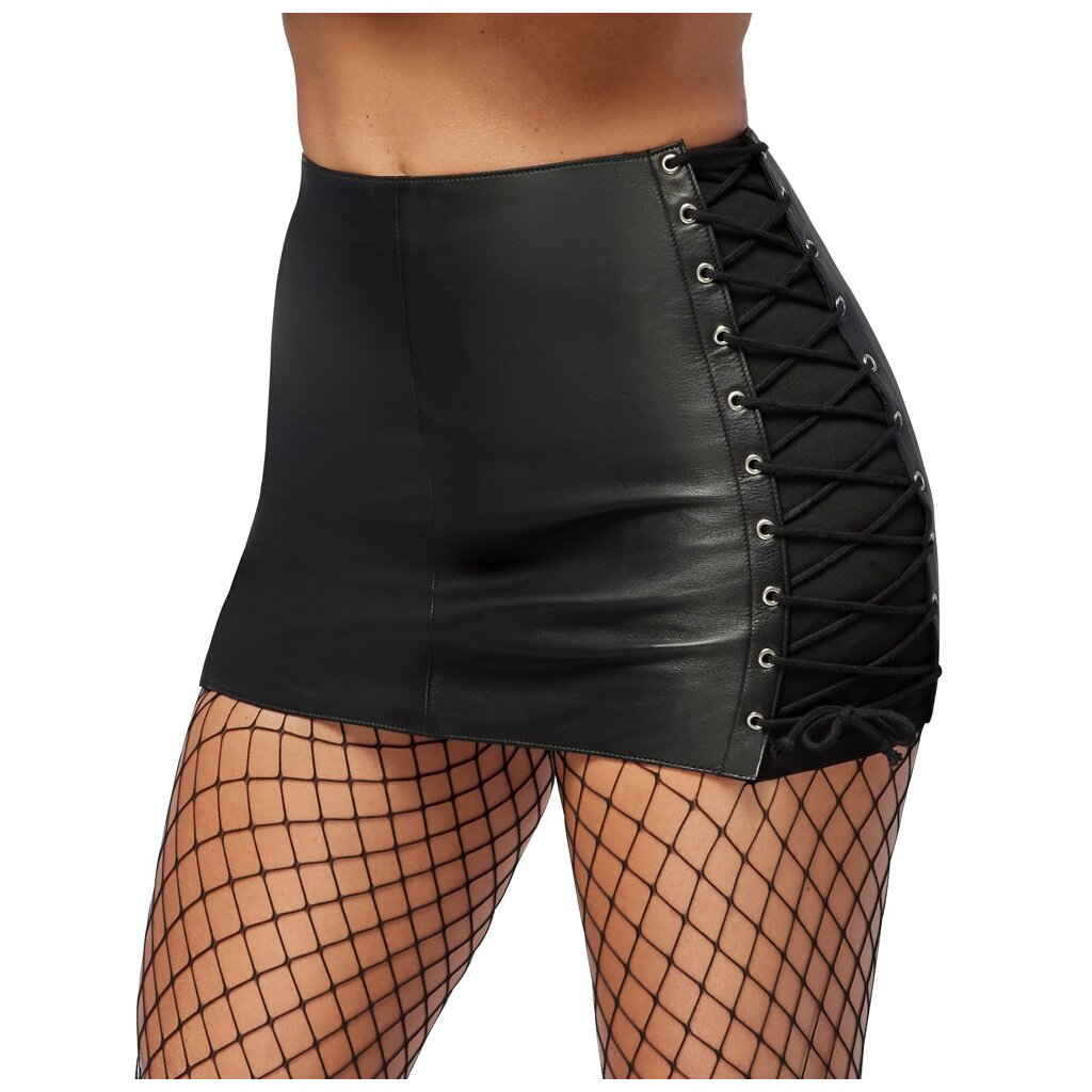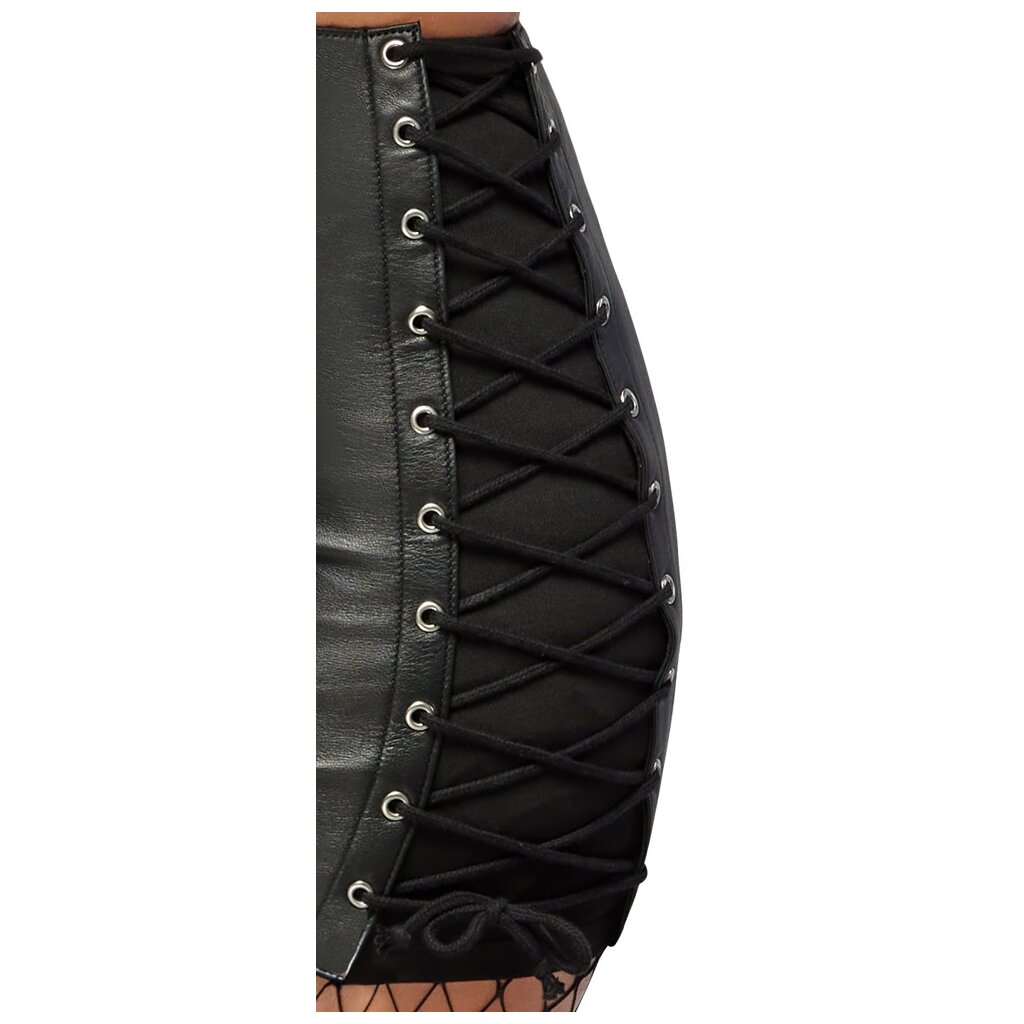 Kurzer, schmaler Rock von ZADO aus weichem Lammfell. Mit seitlichen Stretch-Einsätzen und dekorativer Schnürung aus silbernen Metallösen. Variable Schnürung für eine perfekte Passform. Reißverschluss auf der Rückseite.