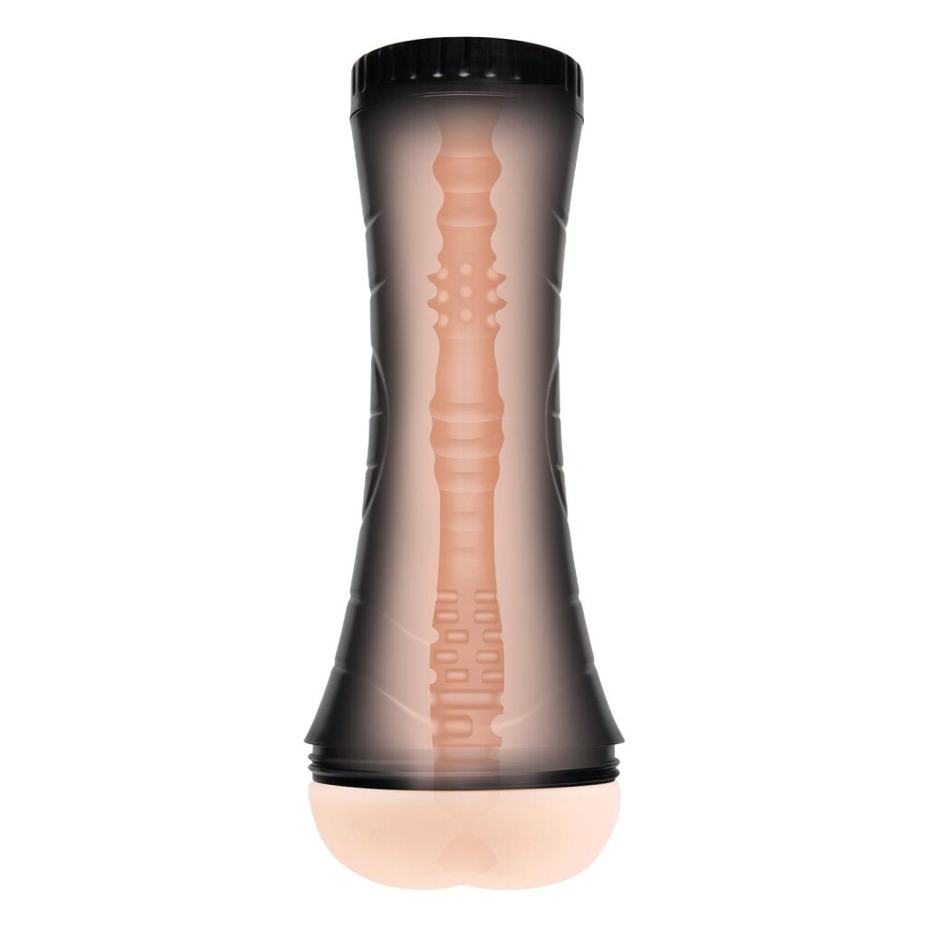 Im Inneren befindet sich eine strukturierte Hülse mit spiral- und rippenförmigen Texturen, die sich über die gesamte Länge erstrecken und eine gleichmäßige, intensive Stimulation ermöglichen.
