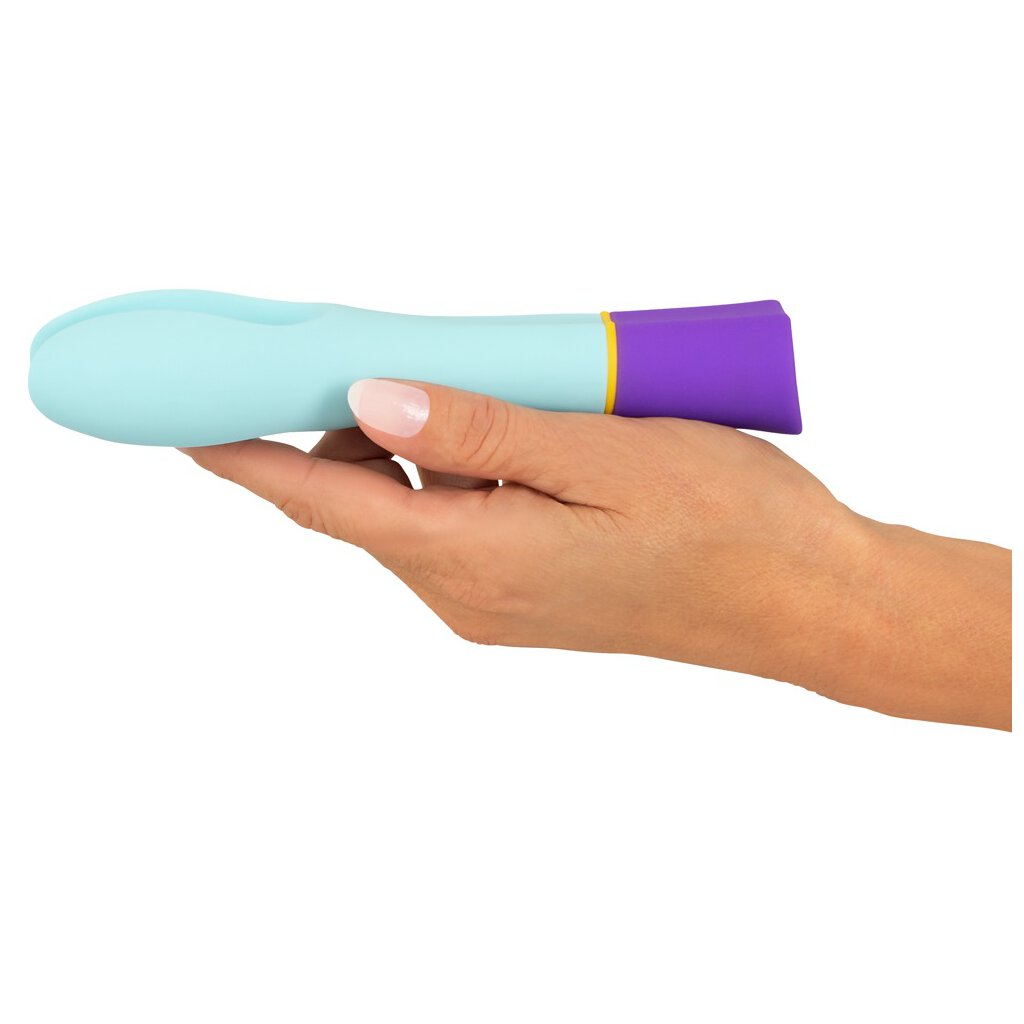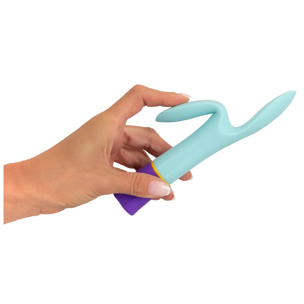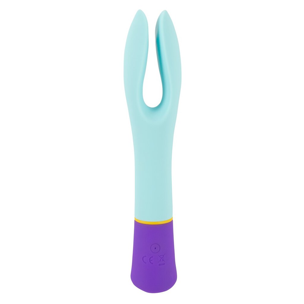 Leistungsstarker Doppelvibrator von bunt. in trendigem Color-Blocking. Mit 2 beweglichen Vibrationsarmen, perfekt für die gezielte Stimulation von Lustpunkten (z.B. an Klitoris, Brustwarzen, Hoden, Perineum etc.). Kann auch vaginal und anal eingeführt werden. Der leichte Vibrator liegt gut in der Hand und seine seidig weiche Textur sorgt für maximalen Verwöhnkomfort.