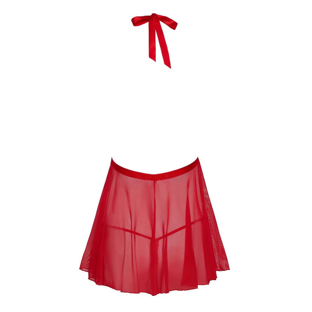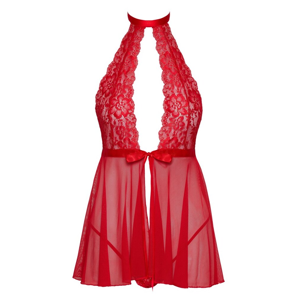 Kurzes, ausgestelltes Babydoll von kissable in rotem, transparentem Stoff aus wunderschöner floraler Spitze (Oberteil) und feinem Powernetz (Rockteil). Seidig weich und dehnbar für einen hohen Tragekomfort. Großzügiger Ausschnitt vorne vom Dekolleté bis zum Taillenbund. Der Satin-Halfterneck wird im Nacken geschnürt und der Satin-Bund wird vorne geschnürt. Rückenfrei. Der passende kleine Spitzenstring ist im Lieferumfang enthalten.