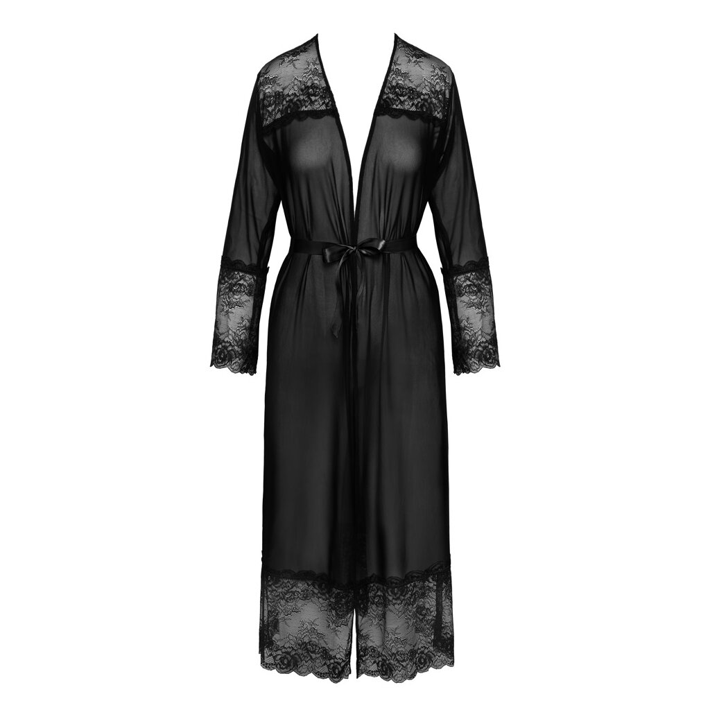 Long kimono by kissable made of fine power mesh with elegant lace inserts on the shoulders, long sleeves and hem. Soft and stretchy all over for maximum comfort. With satin tie belt.