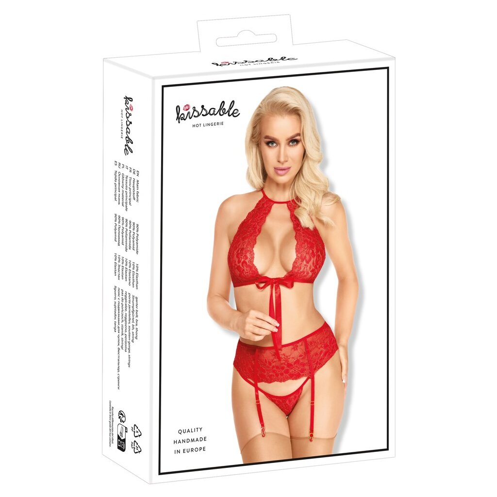 Soutien-gorge souple, porte-jarretelles & string en kit de kissable entièrement en fine dentelle rouge avec des reflets et des détails dorés. Doux et élastique sur tout le pourtour pour un confort maximal. Soutien-gorge stylé à l'avant avec nœud de satin, dans la nuque et dans le dos avec fermeture à crochets. Porte-jarretelles à l'arrière avec un nœud en satin, les jarretelles sont réglables. Le petit string en dentelle séduit avec deux fines lanières en stretch qui se rejoignent à l'entrejambe. Livré sans bas. Taille S/M / Composition du matériel : 90% polyamide, 10% élasthanne